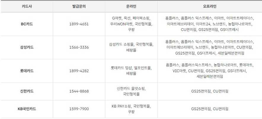 단, 발급 받은 카드사에 따라 구매할 수 있는 온오프라인 구매처가 다르니, 미리 확인 후 발급 받으시기 바랍니다.
